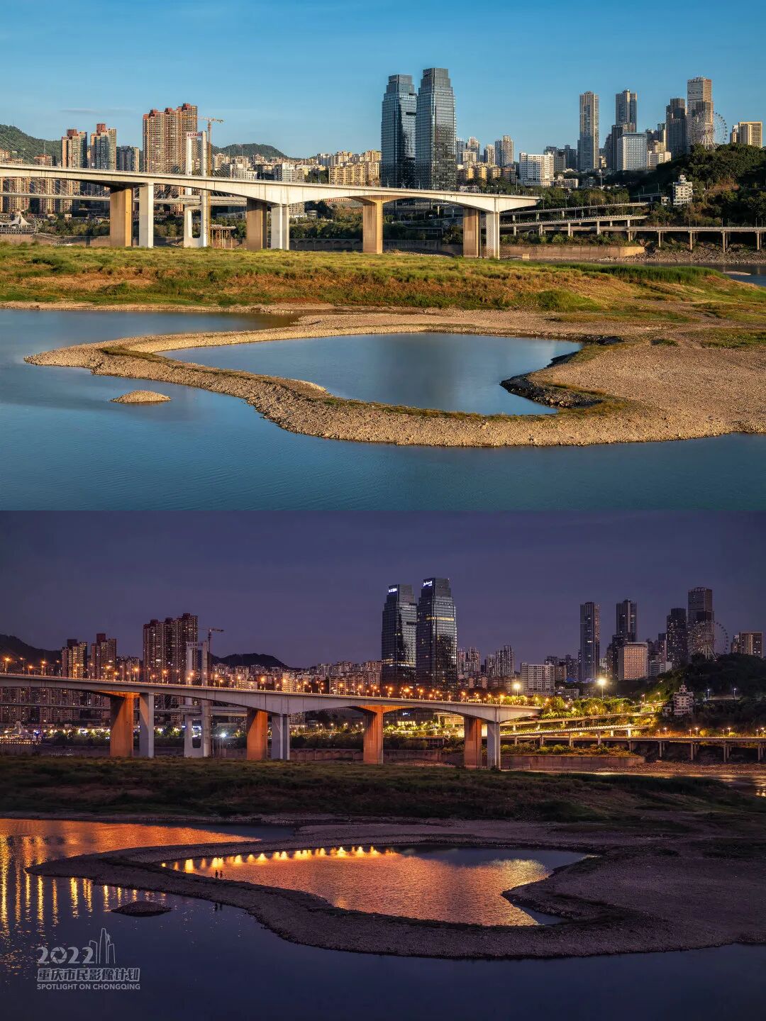 今年夏天遭遇大旱,长江汛期反枯,裸露出大片河床。我从渝中区南区路牛顿能源加油站旁的小路径直走上滨江步道,向珊瑚坝方向望去,发现了这个因水位降落而形成的“心湖”。