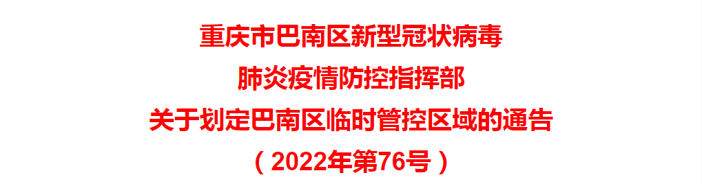 10月11日,重庆市巴南区新型冠状病毒肺炎疫情防控指挥部发布关于划定巴南区临时管控区域的通告(2022年第76号)。