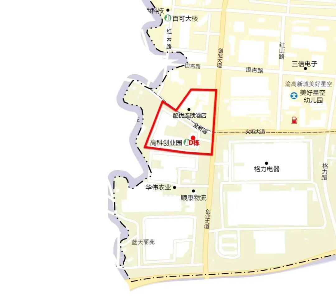 二郎街道创业大道111号、创业大道、创业大道103号高科创业园和红云路合围区域(详见附图)。