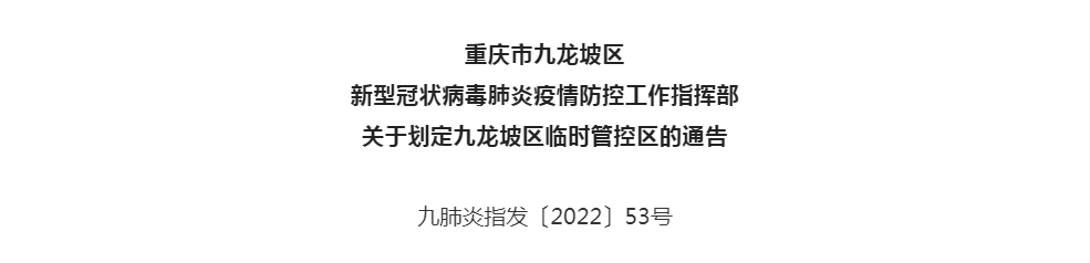 根据当前九龙坡区疫情防控工作需要,按照《新型冠状病毒肺炎防控方案(第九版)》相关规定,经区疫情防控工作指挥部研究决定,自2022年11月1日起,在辖区内划定临时管控区。具体如下: