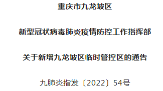 重庆市九龙坡区新型冠状病毒肺炎疫情防控工作指挥部发布关于新增九龙坡区临时管控区的通告。