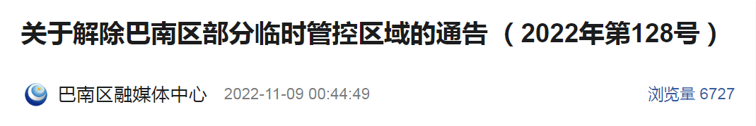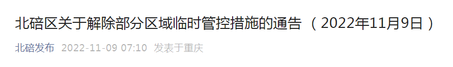 为高效统筹疫情防控和经济社会发展,按照《新型冠状病毒肺炎防控方案(第九版)》相关规定,经专家研判和北碚区新型冠状病毒肺炎疫情防控指挥部研究,决定自2022年11月9日6时起,解除以下区域临时管控措施。