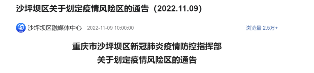 按照《新型冠状病毒肺炎防控方案(第九版)》相关规定,结合当前沙坪坝区疫情防控工作需要,经市、区专家研判和沙坪坝区新冠肺炎疫情防控指挥部研究,并报请市疫情防控指挥部批准,自2022年11月9日10时起,将沙坪坝区部分区域划定为高中低风险区,具体如下:
