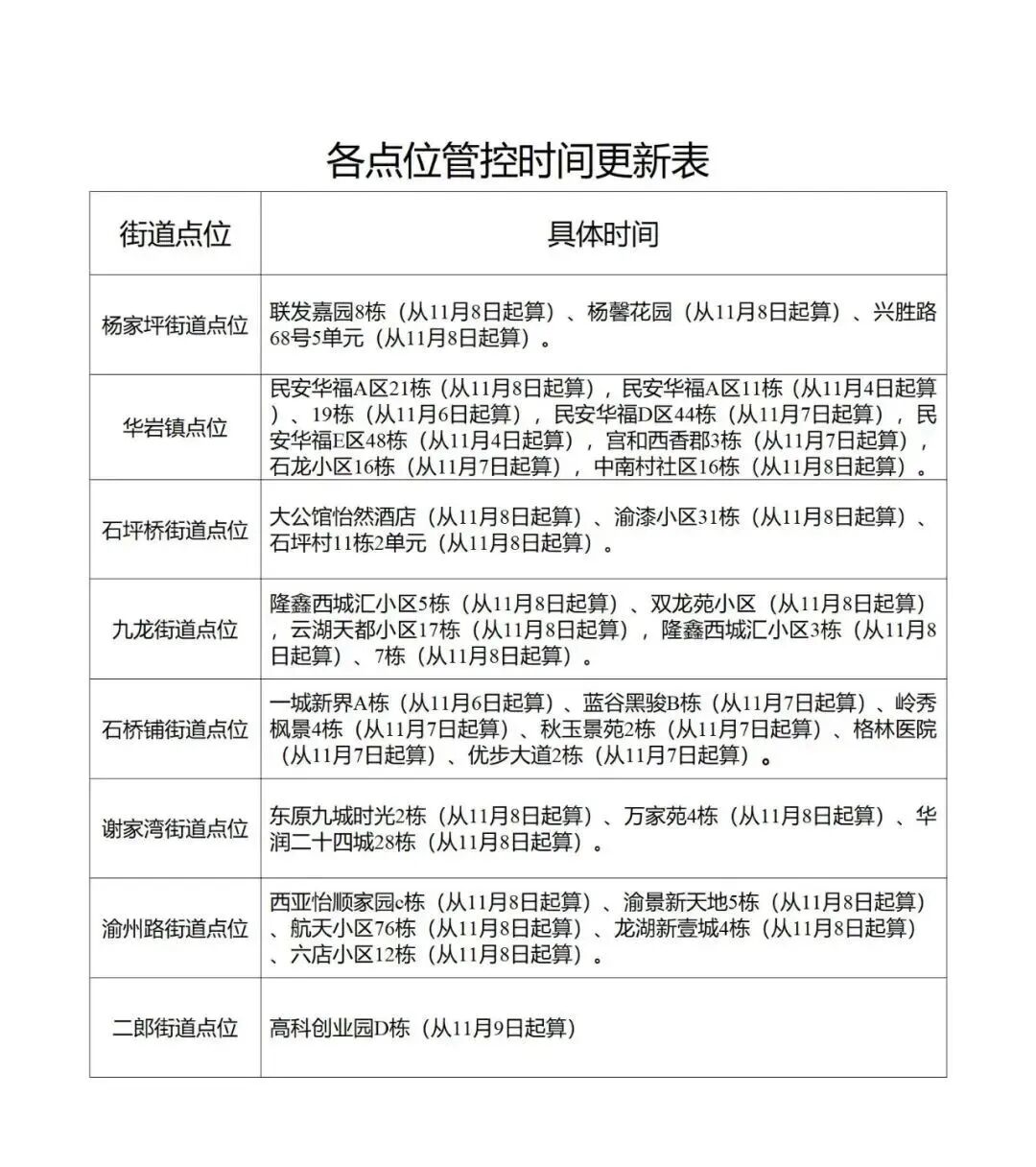 华岩镇点位:民安华福A区11栋、19栋,民安华福D区44栋,民安华福E区48栋,宫和西香郡3栋,石龙小区16栋,中南村社区16栋。
