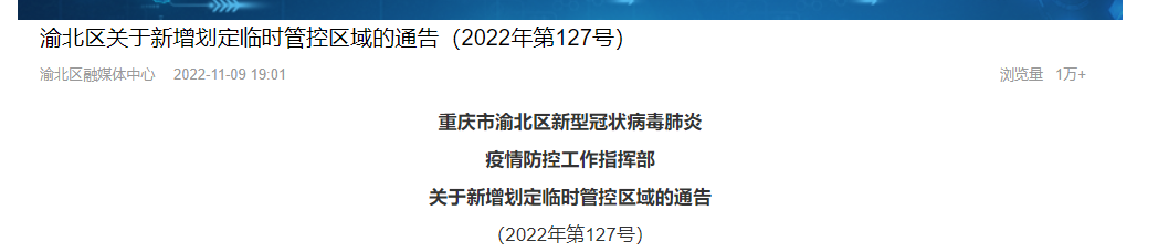 重庆市渝北区新型冠状病毒肺炎疫情防控工作指挥部发布关于新增划定临时管控区域的通告(2022年第127号、第128号)。