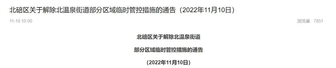 为高效统筹疫情防控和经济社会发展,按照《新型冠状病毒肺炎防控方案(第九版)》相关规定,经专家研判和北碚区新型冠状病毒肺炎疫情防控指挥部研究,决定自2022年11月10日10时起,对北温泉街道恒泰云山御府项目部员工宿舍、新城花园及其附属门店(除一单元)等区域,解除临时管控措施。