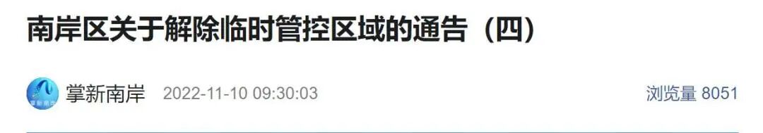 一、自11月10日10时,解除对覃家岗街道华宇城小区、万科金色悦城2期,渝碚路街道金阳牛津街小区,新桥街道新怡康居小区、三陵雅园B区A栋,小龙坎街道天一阁小区、隆鑫天雨方小区、嘉新社区,双碑街道堆金村647号、大石村8号、10号、11号,石井坡街道马桑岚垭7号,天星桥街道雅豪丽景小区、紫荆花园小区,丰文街道龙腾丰文B区及沿街门面、绣美丰文B区及沿街门面的临时管控措施。