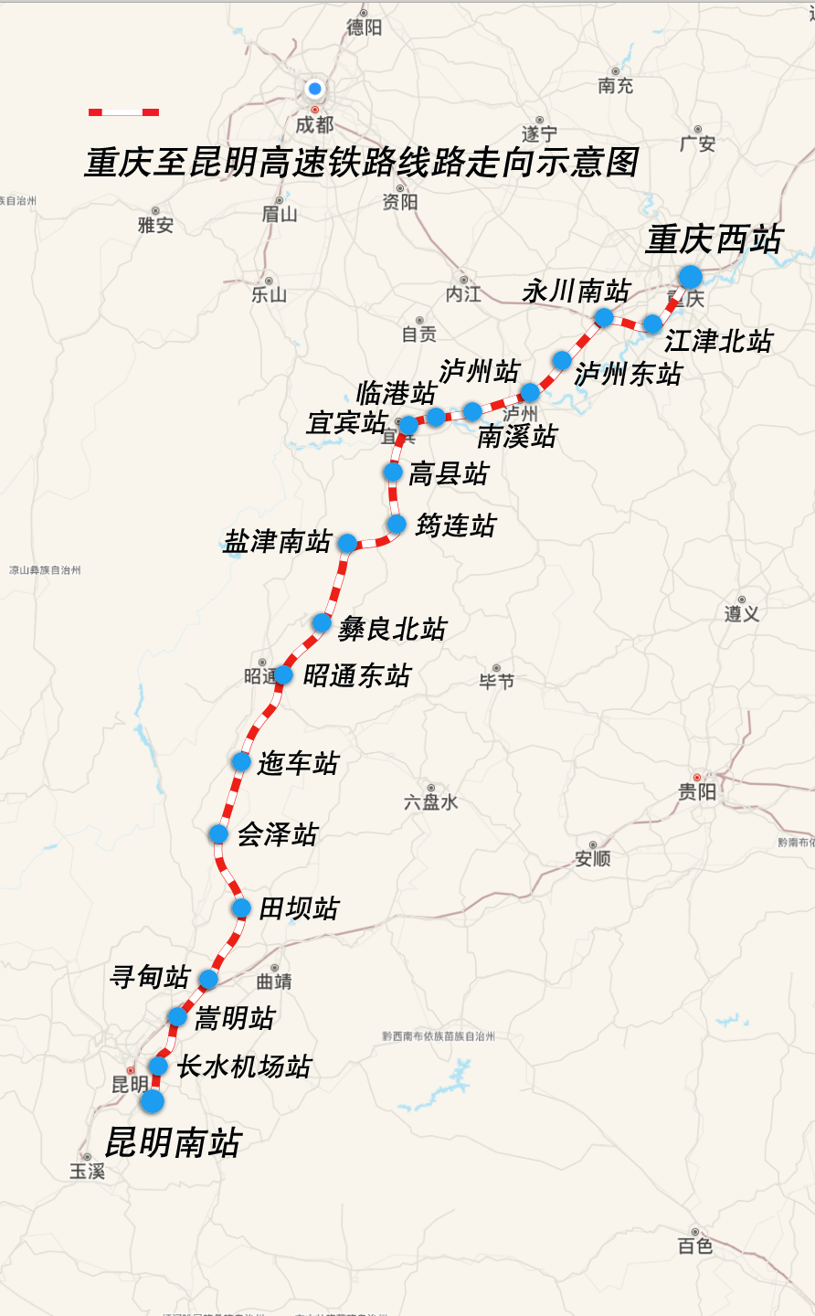 重庆至昆明高速铁路线路走向示意图
