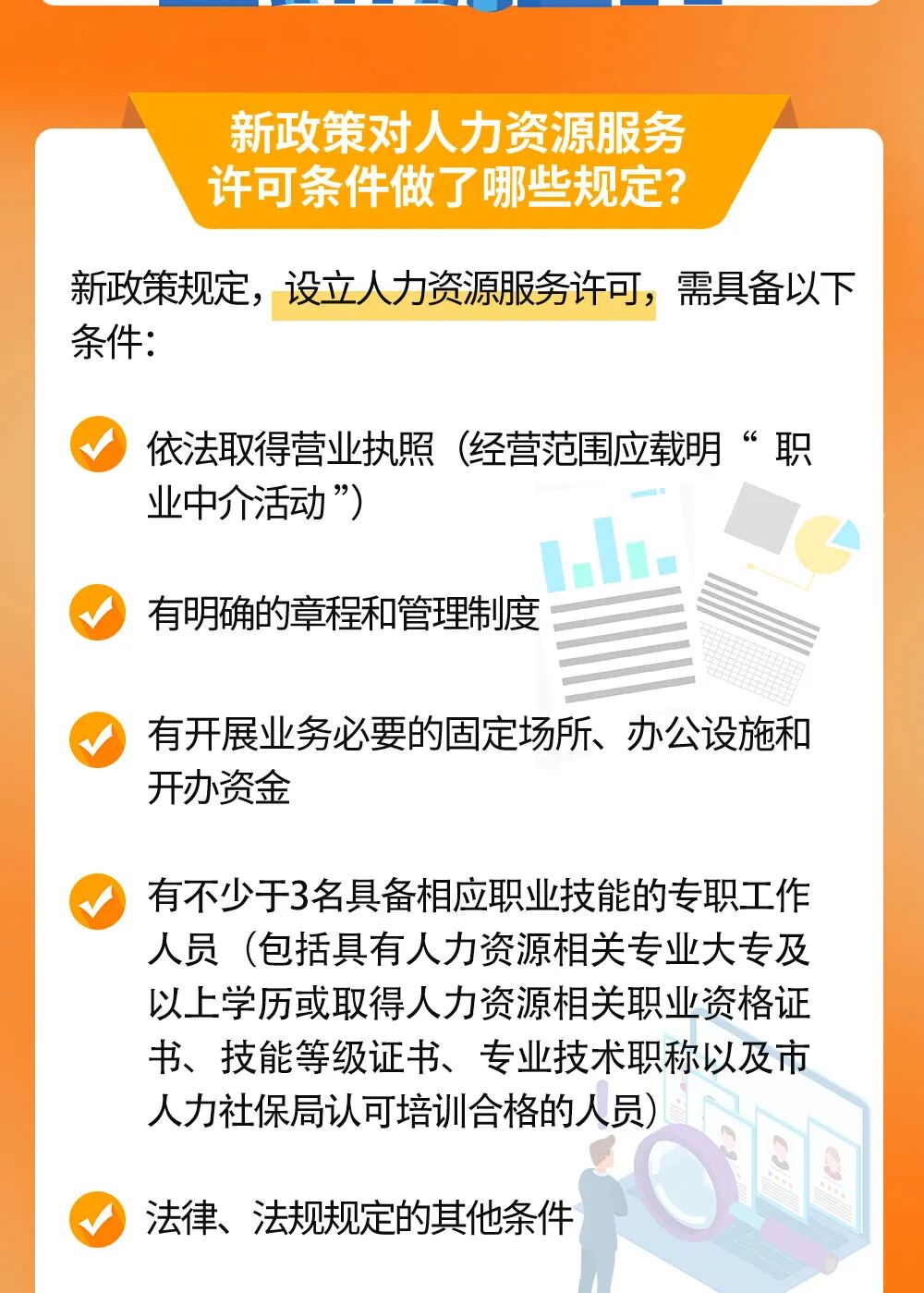 《通知》取消了对固定场所面积、开办资金数额规定,将专职工作人员的要求从拥有职业资格放宽至拥有职业技能即可,有效降低行业准入门槛。同时规定了人力资源服务许可告知承诺审批流程,适用告知承诺,人力资源服务许可审批不再开展实质核查,结果当场公布,最快当天即可拿证,极大方便人力资源服务机构许可设立。