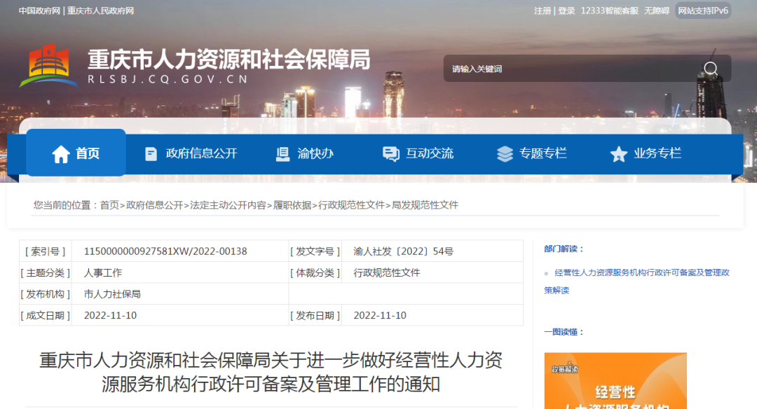 《通知》明确,全市人力资源服务机构、人力资源服务业务都由注册地区县人力社保局负责,市人力社保局不再经办人力资源服务许可事务。在注册地区县人力社保局办理相关事项,不仅可避免群众多跑路、跑远路,更有利于提高市场管理服务效能。