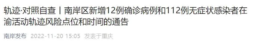 2022年11月18日,南岸区新增报告12例确诊病例(确诊病例1-12)和112例无症状感染者(无症状感染者1-112)。现将在渝主要活动轨迹的风险点位和时间通告如下: