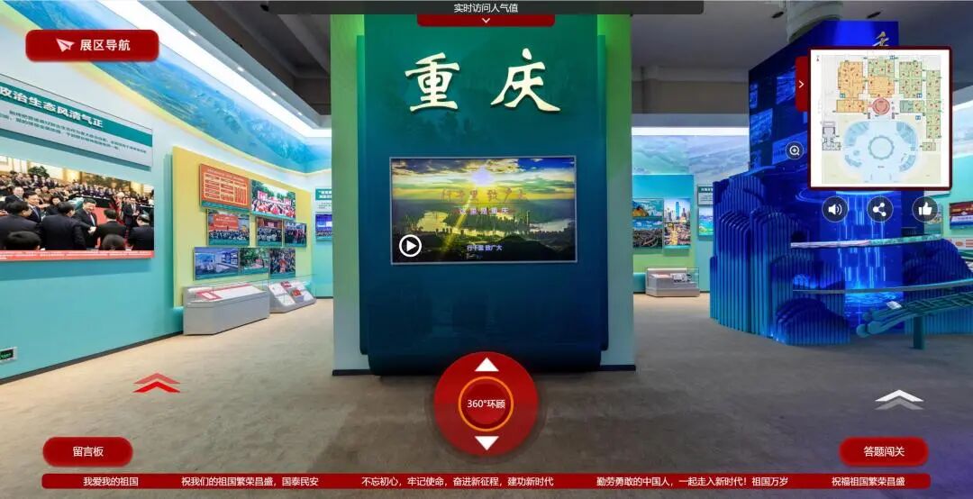 网上展馆设有导航地图,配备语音解说服务,供观众浏览时选择使用。通过网上观展,观众不仅可以随时发表留言表达观展感受、为家乡展区点赞,还可以参与在线答题闯关。同时,网上展馆还具有360度环顾功能,点击按钮即可漫游相关展区。