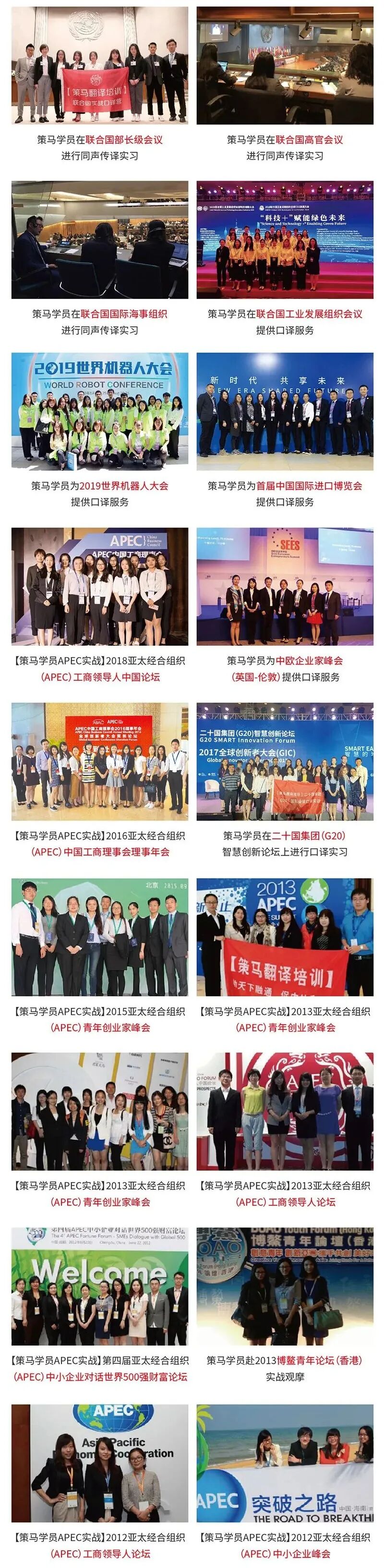 “策马翻译培训”高度重视学员口译实践,凭借丰富的国际会议口译业务资源,创造性地将国际会议的高端现场与学员的学习成果无缝衔接。从APEC峰会到G20峰会,从联合国会议到中国国际进口博览会,从中欧企业家峰会到中澳企业家峰会......从优秀学子中遴选佼佼者亲临境内外一线投身顶级翻译实战及观摩,累计人次已逾两千人。