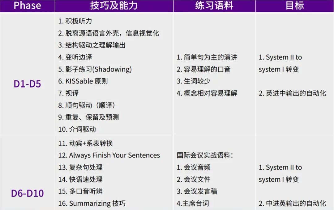 ●课程紧扣应用型同传技能,高度注重对学员同传实操能力的扎实训练,以技能习得、方法解析、经验指引为线索,通过全真训练,“一站式”帮助学员构建同传思维,掌握同传技法,铸就同传素养。