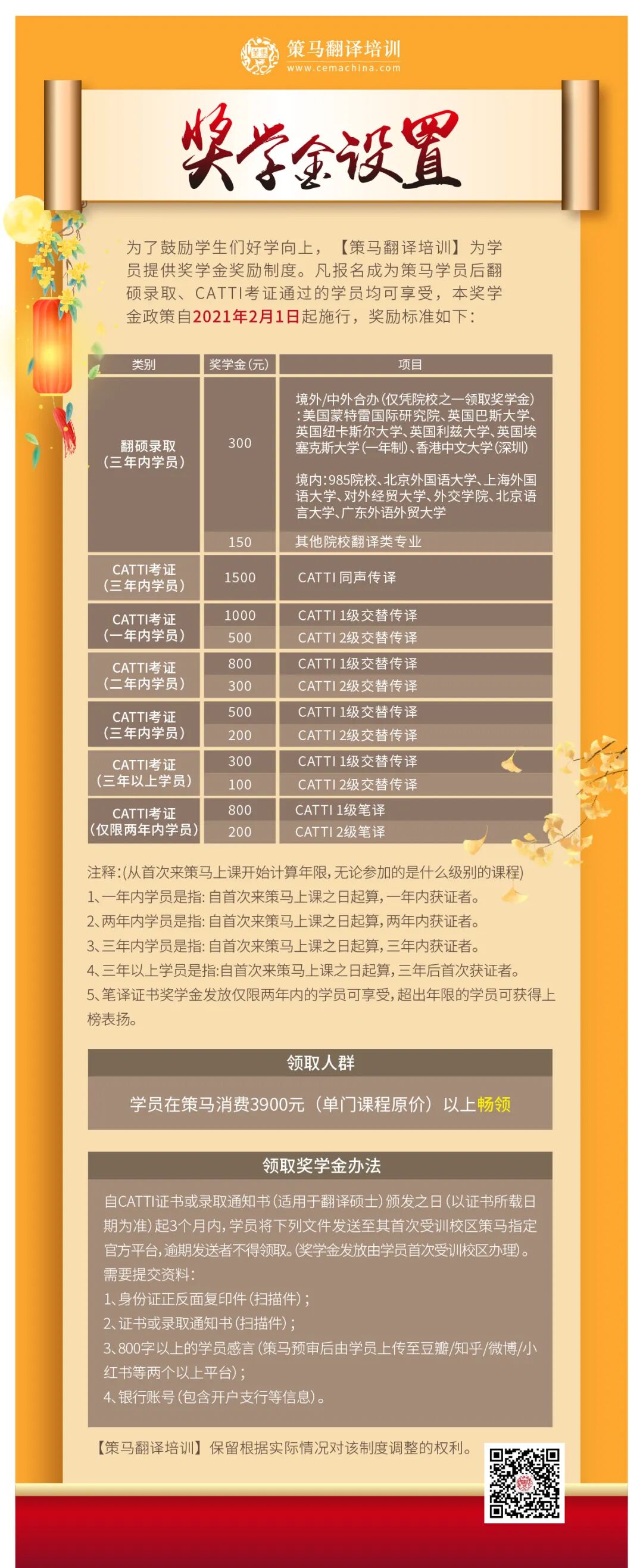 凡通过CATTI口译/笔译考试,或留学、考研、保研被录取的学员,均可享受策马提供的奖学金。奖励标准见下方(图1)。