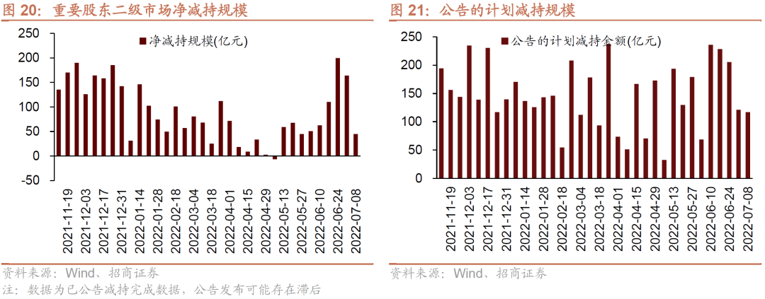 资金需求方面,7月4日-7月8日,IPO融资金额回落至69.8亿元,共有5家公司进行IPO发行,截至7月11日公告,未来一周将有7家公司进行IPO发行,计划募资规模86.5亿元。重要股东净减持规模缩小,净减持44.8亿元;公告的计划减持规模116.8亿元,较前期下降。