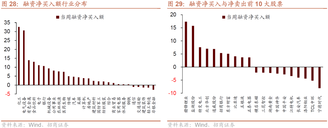 7月4日-7月8日,融资资金净流入162.2亿元。具体来看,本周融资资金买入化工(+32.6亿元)、电气设备(+30.7亿元)、有色金属(+14.0亿元)等行业,净卖出非银金融(-2.6亿元)、轻工制造(-1.4亿元)、建筑装饰(-1.3亿元)等行业。个股方面,融资净买入规模较高的为赣锋锂业(+17.4亿元)、盐湖股份(+15.8亿元)、特变电工(+7.6亿元)等;融资净卖出规模较高的包括宁德时代(-8.1亿元)、TCL中环(-5.2亿元)、洛阳钼业(-4.4亿元)等。
