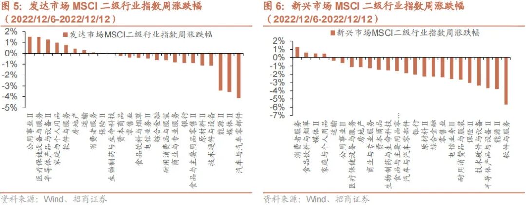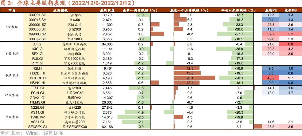 上周海外股市涨少跌多。美股方面,道指上涨0.2%,纳指、标普分别下跌0.9%、0.2%。过去一周市场主要关注美国经济数据、欧洲央行动态、俄油限价争端等方面。美国经济数据方面,12月8日,美国劳工部公布,上周美国首次申请失业救济人数为23万,环比此前一周的22.5万略有回升,符合市场预期。上周持续申请失业救济的人数为167.1万,高于预期的161.8万,升至2月初以来最高水平,此前一周为160.8万,释放了劳动力市场降温的部分信号。12月9日,美国劳工部发布的数据显示,美国11月PPI同比增长7.4%,较上月修正后的8%有所放缓,但高于市场预期的7.2%;11月PPI环比增长0.3%,与修正后的上月数据0.3%持平,但同样高于预期的0.2%。同日公布的美国12月密歇根大学消费者信心指数系列数据显示,美国1年通胀预期初值意外下降至4.6%,创2021年9月以来新低,前值为4.9%;12月消费者信心指数从上个月的56.8升至59.1,远高于市场普遍预期的57,但仍低于去年同期的70.6。美国将于12月14日周三公布12月议息会议决策。美国财政部长耶伦预计到2023年底通胀将大幅下降,但警告经济衰退风险仍然存在。欧洲央行动态方面,欧元集团再次警告称,欧元区和大多数成员国在今年冬天面临技术性衰退的风险。12月6日,欧洲央行首席经济学家连恩表示预计将需要更多的加息,但我们已经完成了很多,明年通货膨胀率将降至6%-7%。12月7日,欧洲央行管委Herodotou表示欧洲央行将会进一步加息,现在确定12月的加息规模为时尚早,12月的经济预期对利率走势至关重要,量化紧缩政策必须清晰、透明。12月8日,欧洲央行表示旨在缓和天然气价格飙升的欧盟天然气价格上限计划实际上可能危及金融稳定,需要重新设计;欧洲央行行长拉加德发布以“应对金融稳定挑战”为主题的讲话。俄油限价争端方面,12月5日,欧盟对俄油禁令正式生效。12月9日,据媒体报道,俄罗斯总统普京表示,G7设定的价格上限不会对俄罗斯预算产生任何负面影响,俄罗斯不会因限价令遭受经济损失,因为每桶60美元的门槛接近俄罗斯原油当前的市场价格。普京同时重申,俄罗斯不会向任何实施价格上限措施的国家出售石油。他指出,限定价格可能导致的国际原油价格上涨的后果,将作用于限价令的始作俑者。普京称俄罗斯可能会减产石油,以回应七国集团(G7)对俄罗斯石油出口设置价格上限的做法。“我现在并不是说这是一个决定,但如果有必要,我们会考虑可能的减产。”近期他将签署法令。普京还表示,欧亚经济联盟有必要在最近两年内形成统一天然气市场。