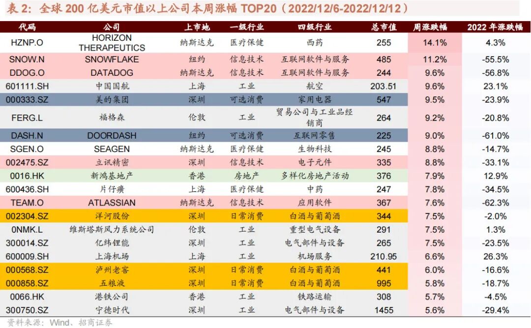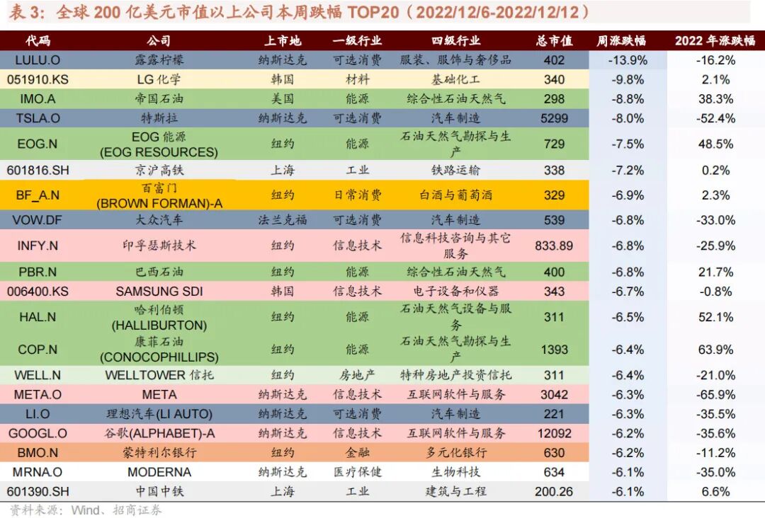 过去一周大涨的200亿美元以上市值公司中,工业、信息技术公司居多,过去一周领跌的200亿美元以上市值公司中,能源、可选消费行业公司居多。