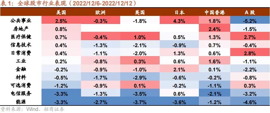 具体来看,美股方面,公共事业板块表现较好,能源、电信服务板块表现较差。欧股方面,板块普跌,其中能源板块跌幅最大。英国股市方面,医疗保健板块表现较好,能源、电信服务板块表现较差。日本股市方面,公共事业、金融板块表现较好,能源板块表现较差。港股方面,房地产板块表现较好,电信服务板块表现较差。A股方面,日常消费、医疗保健板块表现较好,公共事业、能源板块表现较差。