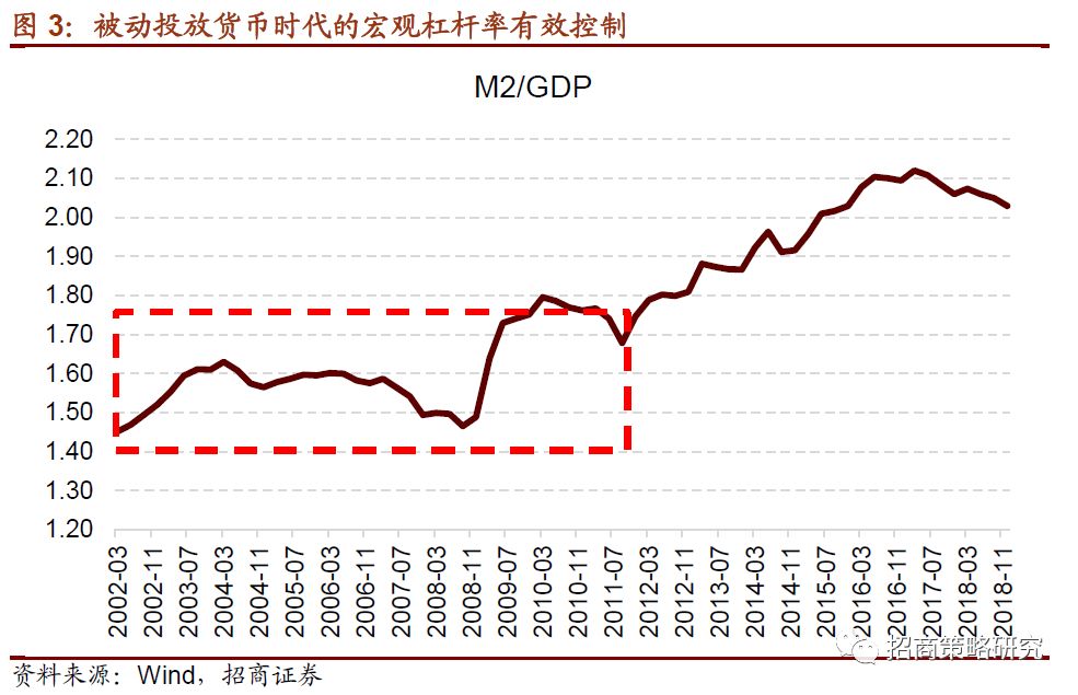 在被动投放时代,外汇的增加与出口以及境外投资直接相关,因此基础货币的增加与投资和对外贸易直接联系。这个时代宏观杠杆率有效控制,M2/GDP介于1.4~1.8之间。