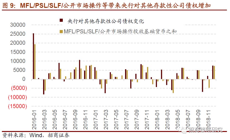 2014年之后,外汇占款逐步回落,外汇占款投放基础货币难以为继。2014年,补充质押贷款(PSL)、中期借贷便利(MLF)相继问世。除此之外,还有再贷款、再贴现和逆回购等工具。这些政策工具的本质都是主动、直接借钱给金融机构,从而投放基础货币。因此,在央行资产负债表中,体现为资产端的“对其他存款性公司债权”和负债端的“储备货币”同步增加。MLF、PSL、SLF和公开市场操作投放基础货币与对其他存款性公司债权的变化基本吻合。
