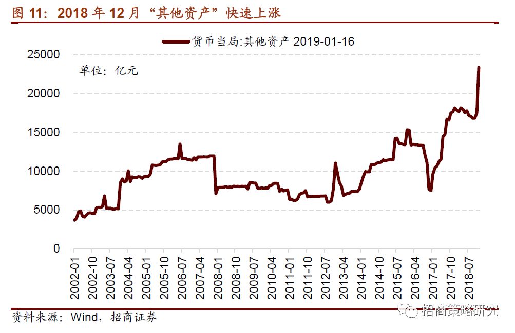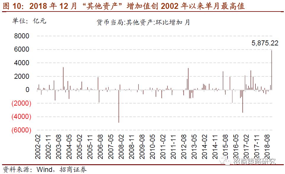 2018年12月央行资产负债表的扩张与其资产负债表中的“其他资产”科目大幅扩张有着紧密联系。2018年12月份其他资产的增加5875亿,为2002以来最高值。