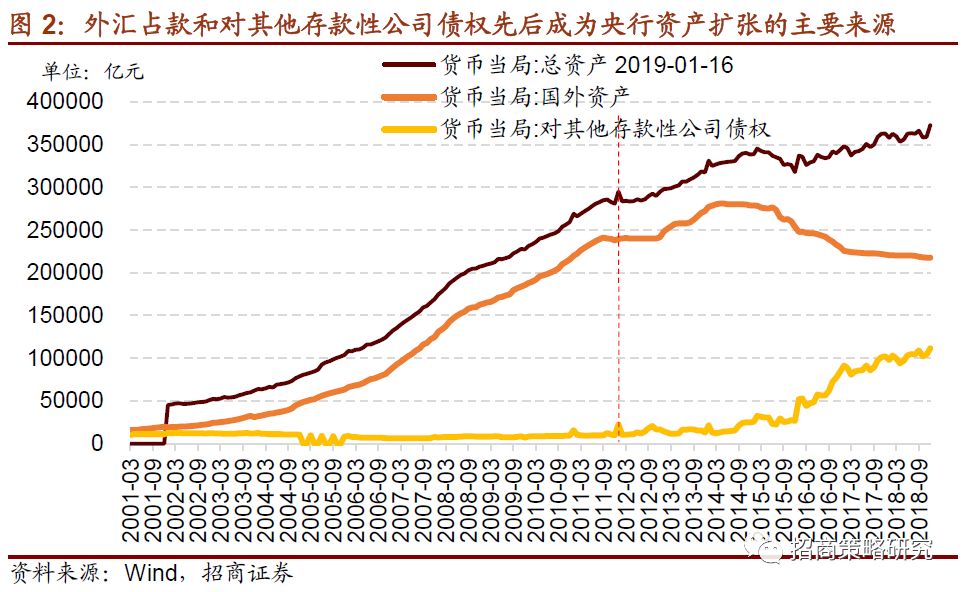 在2011年之前,我国实施强制结售汇制度,企业和个人必须将多余的外汇卖给外汇指定银行,外汇指定银行必须把高于国家外汇管理局头寸的外汇在银行间市场卖出。最终由央行买入,央行买入外汇的同时增加对银行的存款。因此我们可以看到,货币当局的总资产基本与国外资产或者说外汇储备同步增加。总资产的增加几乎由外汇储备贡献。央行吸收外汇,被动投放基础货币。