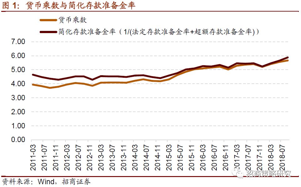 央行的负债科目储备货币占总负债的88.8%,这个储备货币就是我们通常说的基础货币,基础货币乘以货币乘数就等于近似我们的广义货币M2。而货币乘数,近似等于“法定存款准备率+超额准备金率”的倒数。