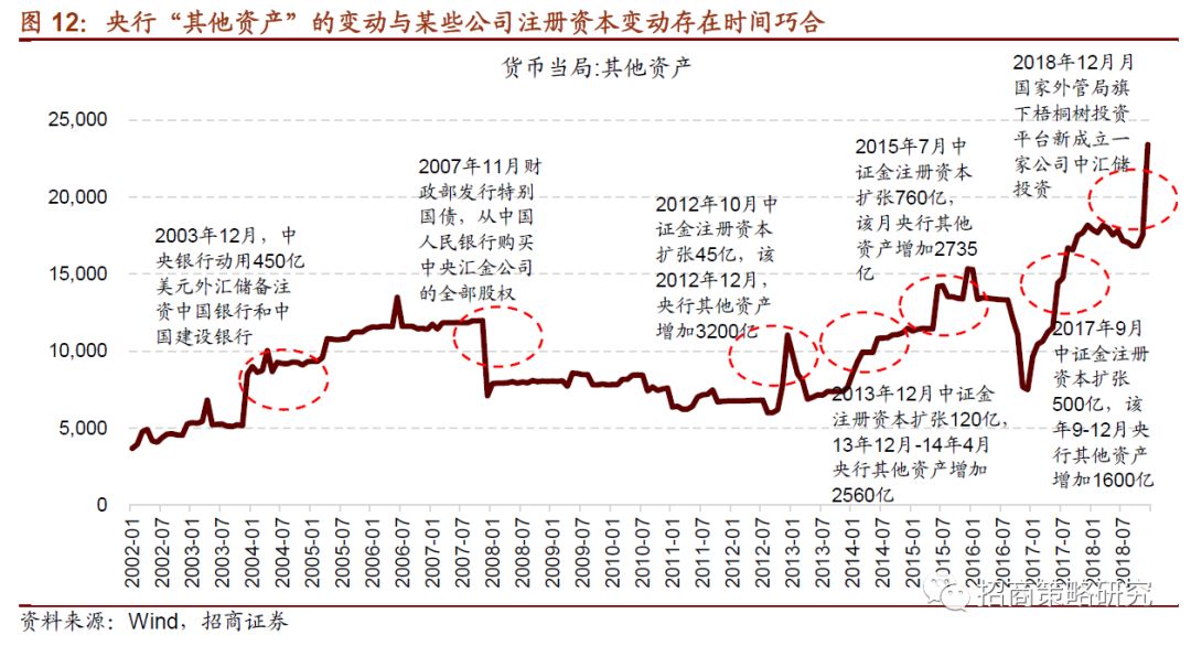 ⚑ 第一,与某些公司注册资本变动的时间巧合:2003年央行注资中行和建行;2007年财政部从央行购买中央汇金股权,同期其他资产下降;2012年、2013年、2015年、2017年证金注册资本扩张后,其他资产增加;2018年12月外管局投资平台下新成立“中汇储”投资公司。