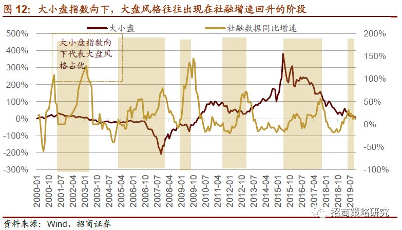2003年、2005~2006年、2012年、2016-2017、2019年均是新增社融明显回升,社融对于企业盈利有着明显的领先作用。市场在经济预期改善,企业盈利预期回暖的环境下偏好大盘蓝筹风格。