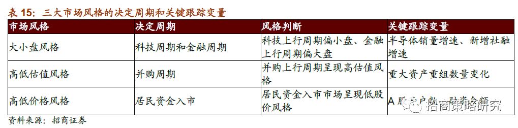 根据上面论述,三大市场风格的决定周期和关键跟踪变量如下所示,虽然表面看来,风格决定如此之简单,但是对于科技周期、金融周期、并购以及居民资金入市的判断均具有相当的难度。