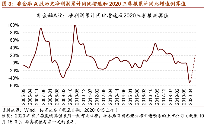 根据一致可比口径测算,(即2020年三季报盈利测算值的样本为目前已经公布盈利情况的上市公司),非金融A股2020年三季报净利润累计同比增速为22.1%,单季度净利润同比增速为35.2%。(注意:此处测算样本为目前已经公布三季报业绩预告的上市公司,由于可得样本有限,因此测算值与真实值存在一定的偏差)