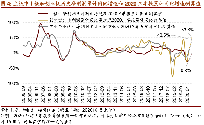 ⚑根据一致可比口径测算,(即2020年三季报盈利测算值的样本为目前已经公布盈利情况的上市公司),非金融A股2020年三季报净利润累计同比增速为22.1%,单季度净利润同比增速为35.2%。(注意:此处测算样本为目前已经公布三季报业绩预告的上市公司,由于可得样本有限,因此测算值与真实值存在一定的偏差)中小板和创业板业绩继续保持改善趋势,主板业绩开始出现加速修复迹象。