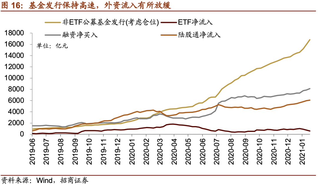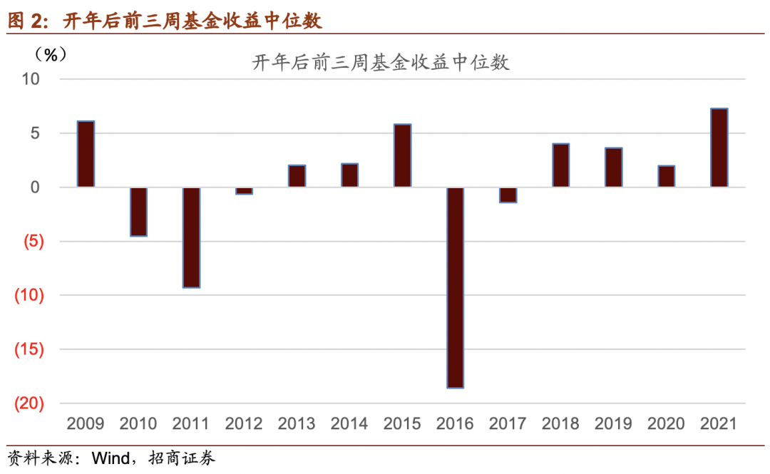 第一,过去两年公募基金获得了较高回报后,虽然市场普遍预计今年预期回报率明显下降,我们在年度策略报告中给出的收益率回报区间是0~10%,但是,开年三周后,主动偏股公募基金的中位数回报率已经达到了7.3%,而且,创下了09年以来同期中位数收益率新高,堪比2009年和2015年。赚钱效应十分明显。近期,渠道反馈有很多对偏股基金从来不感兴趣的投资者开始主动关注偏股基金。春节前后亲朋好友聚会,少不了讨论基金的赚钱形势一片大好。