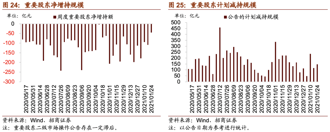 从资金需求来看,重要股东净减持规模较前期下降,计划减持规模有所回升。本周重要股东二级市场增持6.4亿元,减持52亿元,净减持45亿元,净减持规模有所下降,其中净减持规模较高的行业主要集中在医药、机械设备、化工等行业。另外,公告的计划减持规模147亿元,较前期有所回升。