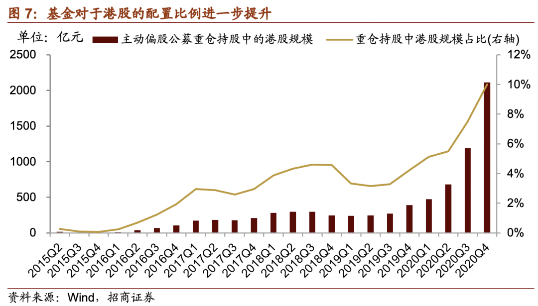 我们在此前写过深度报告从多个角度比较了A股和港股的投资价值,认为今年港股会更强,其中一个关键理由就是公募配置港股比例更高,今年以来发行的产品很多配置港股比例上限可以达到50%。从实际操作来看,公募重仓股中港股市值已经攀升至2000亿,重仓持股中港股占比已经攀升至10%。从1月份南下资金规模来看,这一比例有望进一步抬升。