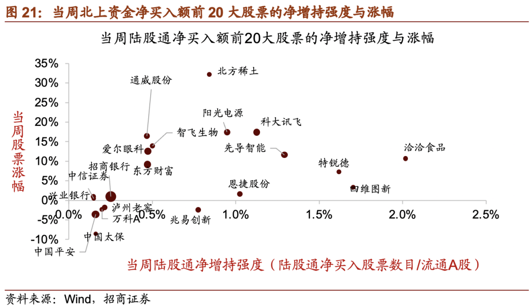 个股方面,北上资金净买入规模最高的仍为招商银行,净买入规模27亿元;其他净买入较多的包括中国平安、东方财富、爱尔眼科等;净卖出规模较高的包括五粮液、伊利股份、贵州茅台等。
