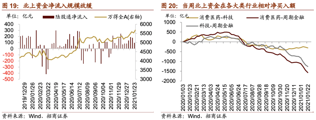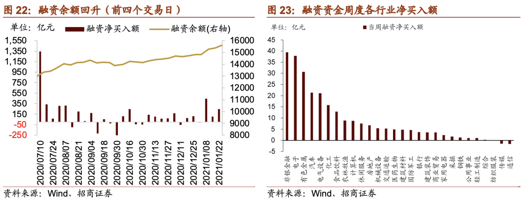 从全周资金流动的情况来看,1月18日~1月24日期间,外资和融资资金均延续净流入,ETF延续净赎回,基金发行规模继续扩大。北上资金当周净流入96亿元,较前期减半;融资资金前四个交易日合计净流入244亿元,较前期提升明显;另外,当周新成立偏股类公募基金合计1108亿元,较前期略有提升,ETF当周净赎回67亿份。
