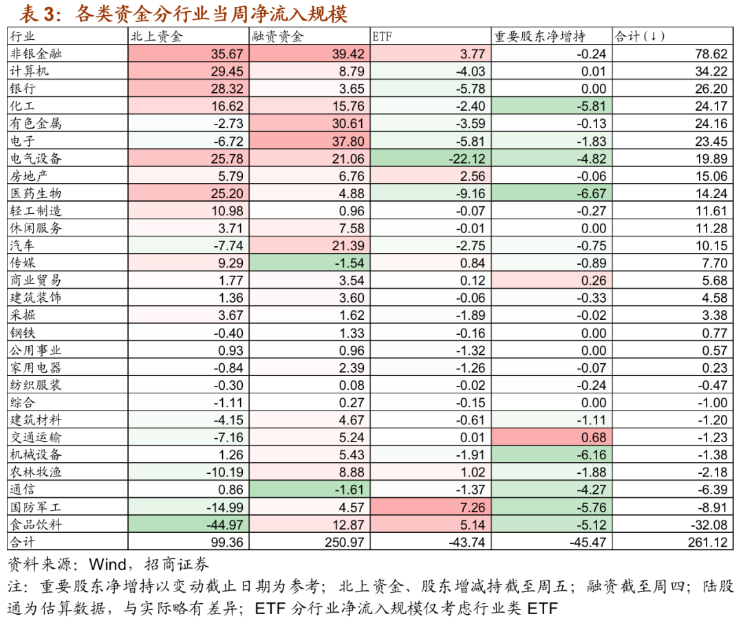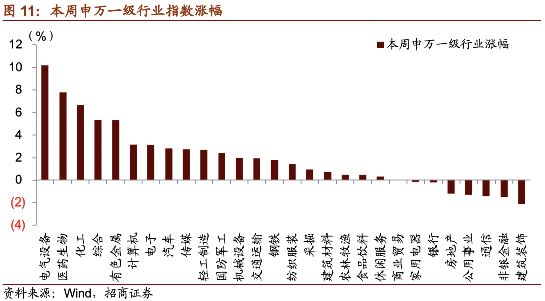 本周市场整体呈现出普涨的行情,其中创业板指、中小板指、中证500、中证1000涨幅领先,中证100、上证指数、上证50涨幅落后,市场风格扩散,前期表现较弱的中小盘代表中证1000等开始有所表现,从成交来看,本周日均成交在万亿以上,但有两个交易日成交不足万亿,资金加速流入港股市场,南向资金全周净买入954.8亿港元,近四周净买入港股规模达2585亿港元,北向净流入有所放缓,全周净流入96亿,连续12周单周净流入,近12周累计净流入规模达1618.6亿,从大类板块上来看,医药、周期涨幅领先,金融风格下跌。