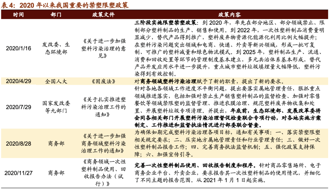2021年1月1日,全国重点城市限塑令开始全面落地,要求禁用一次性不可降解塑料吸管,超市、商场等地禁止使用不可降解塑料包装,部分城市对农产品市场、餐饮、外卖等亦提出了同类要求。