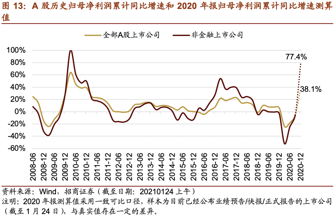从目前最新数据来看(截至1月24日),2020年报业绩预告向好率提升至60.7%,越来越多的公司四季度盈利加速改善。整体A股盈利仍处于2020年二季度以来的盈利上行周期中,全部A股/非金融A股2020年报净利润累计同比增速测算值为38.1%/77.4%(由于可得样本有限,因此测算值与真实值存在一定的偏差),本轮盈利上行周期将会与2021年一季度达到高点。