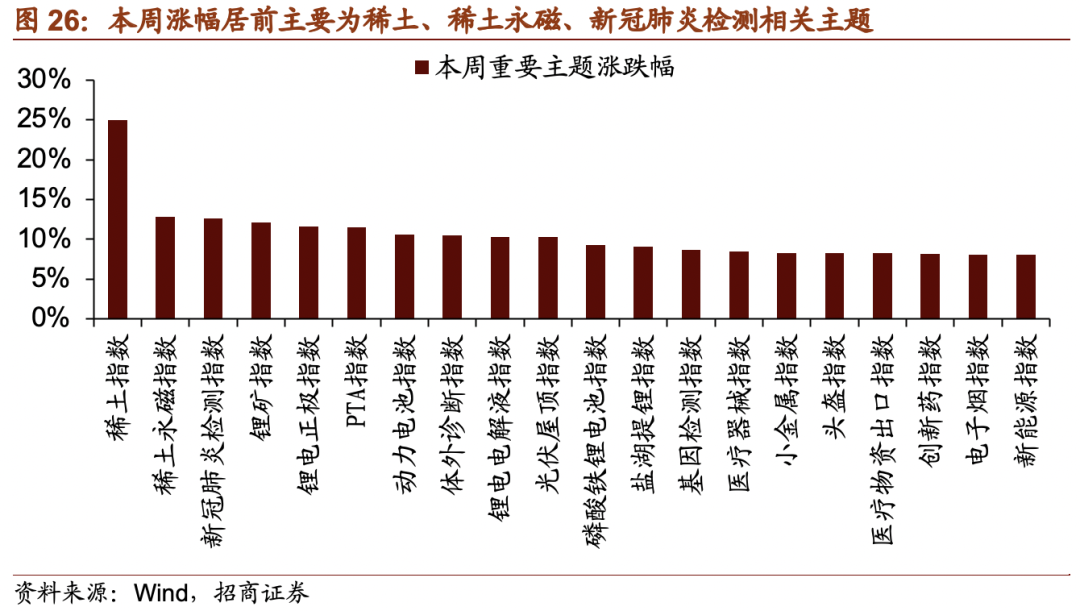 本周市场上涨,Wind全A指数周度上涨2.56%,创业板指涨8.68%,沪深300涨2.05%。本周涨幅居前的主要为稀土、稀土永磁、新冠肺炎检测相关主题。