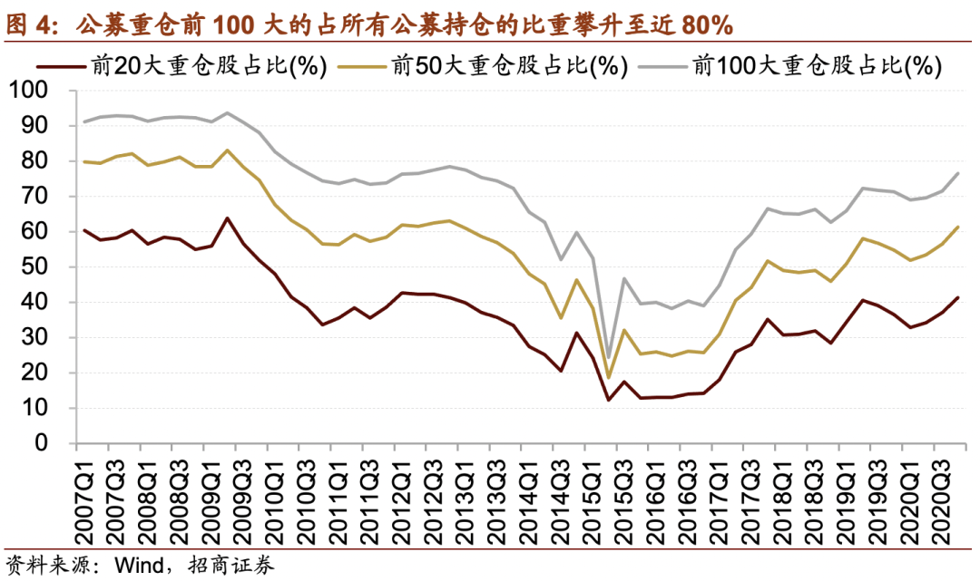 正是由于趋势一的存在,因此公募重仓前100大的占所有公募持仓的比重攀升至近80%。