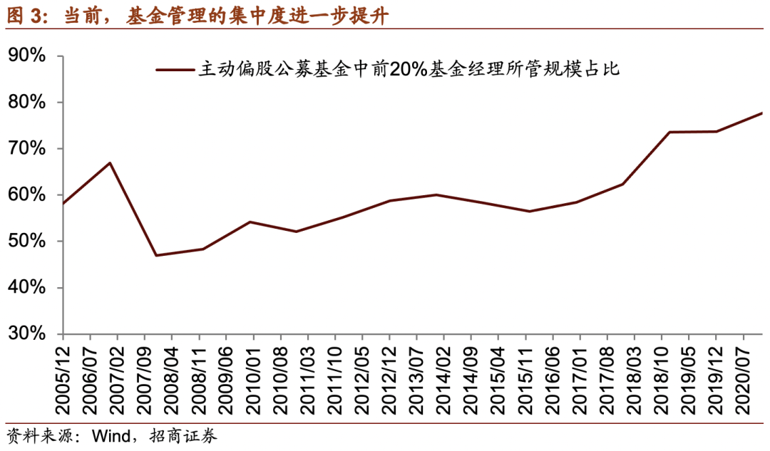 主动偏股基金前20%的基金管理基金规模占全市场比例进一步攀升至77.7%,而过去一段时间爆款基金频出,将会进一步提升基金管理的集中度。