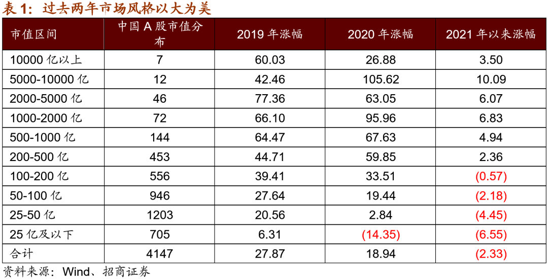 【观策·论市】2020年四季度以来,A股和美股的中小市值公司出现了严重背离,A股中小市值公司整体出现大幅调整,而美股中小市值公司却大幅上涨。美股呈现小票占优的特征。反应了经济基本面的改善和流动性的边际趋弱。但A股却呈现相反的景象,市场普遍认为:1)中国经济增速在下台阶,份额向龙头集中,因此中小公司已经没有机会了;2)当前居民申购基金,基金头部化集中,头部基金经理只买大票;3)A股注册制推进,会逐渐“美股化”“港股化”,很多中小盘逐渐没有成交;4)中国经济增速稳步下台阶,利率中枢会逐渐下行,能够有稳定增长或者ROE比较高盈利能力确定的公司将会非常稀缺,给多高的估值都不为过;5)未来货币政策趋紧,所以大家要拥抱大盘、现金流稳定、高ROE标的;6)A股趋势投资更加重要。我们对这些观点进行了一定探讨,这些观点有些很正确,有些是统计学偏差,有些是片面的,总的来说,当前中国面临的也是经济基本面改善,盈利增速加速上行而流动性趋弱。这种环境和基本面对应的风格特征将会逐步呈现“价值回归”的特征,两类价值:一类是意思就是PEG≤1或者GARP策略可能会回归,增速较高,估值性价比较高的中小价值风格,以及估值处在历史低位短期业绩增速明显回升的大盘价值风格会逐渐回归。