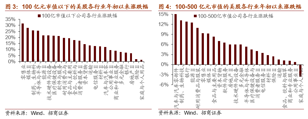 在这些中小市值公司中,医药、零售、媒体与能源行业涨幅较高。从不同市值区间公司各行业涨幅看,在100亿元市值以下的美股公司中,零售业、媒体、制药与生物科技行业年初以来涨幅较高,均在25%以上。此外,能源、技术硬件与设备、医疗设备与服务、软件与服务行业涨幅也在20%以上。在100-500亿市值的公司中,汽车与汽车零部件、制药与生物科技、银行、能源以及耐用消费品与服装行业涨幅较高,均在10%以上。这些涨幅较高的行业均属于当前景气度较高的行业,医药、媒体、软件等行业受益于疫情,汽车与汽车零部件行业受益于电动车渗透率提升,能源行业则受益于新能源的崛起。