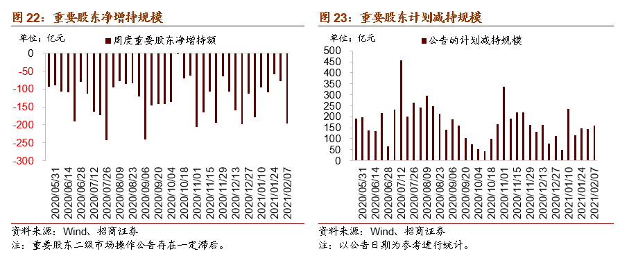 从资金需求来看,重要股东净减持规模较前期明显扩大,计划减持规模略有增加。本周重要股东二级市场增持29亿元,减持225亿元,净减持196亿元,净减持规模明显扩大,其中净减持规模较高的行业主要集中在电子、计算机、医药、机械等行业。另外,公告的计划减持规模159亿元,较前期略有增加。