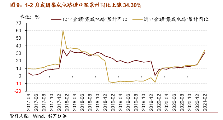 1-2月份集成电路进出口金额累计同比增幅扩大。根据海关总署统计数据,1-2月份我国集成电路进口额累计同比增速为34.30%,相比1月份增速扩大19.7个百分点;1-2月份我国集成电路出口金额累计同比增速为30.80%,相比1月份增幅扩大16.0个百分点。