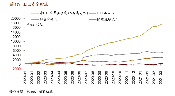 从全周资金流动的情况来看,3月8日~3月12日期间,外资回流,融资资金流出规模扩大,ETF转为净赎回,公募基金发行规模下降。北上资金当周净流入66亿元;融资资金净流出规模扩大,前四个交易日合计净流出137.6亿元;新成立偏股类公募基金358亿份,较前期减半;ETF转为净赎回,净赎回6亿份。